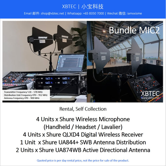 (Rental, Self Collection) Bundle MIC02. Shure QLXD4 Digital Wireless Receivers. Choice of Shure Microphones. Shure Antenna Distribution Unit. Shure Active Directional Antennas.
